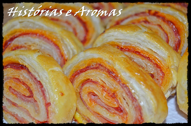 - Aquece-se o forno a 180 graus. Estica-se a massa folhada numa bancada polvilhada com farinha até obter um rectângulo. Dispõe-se por cima o paiola e o fiambre;