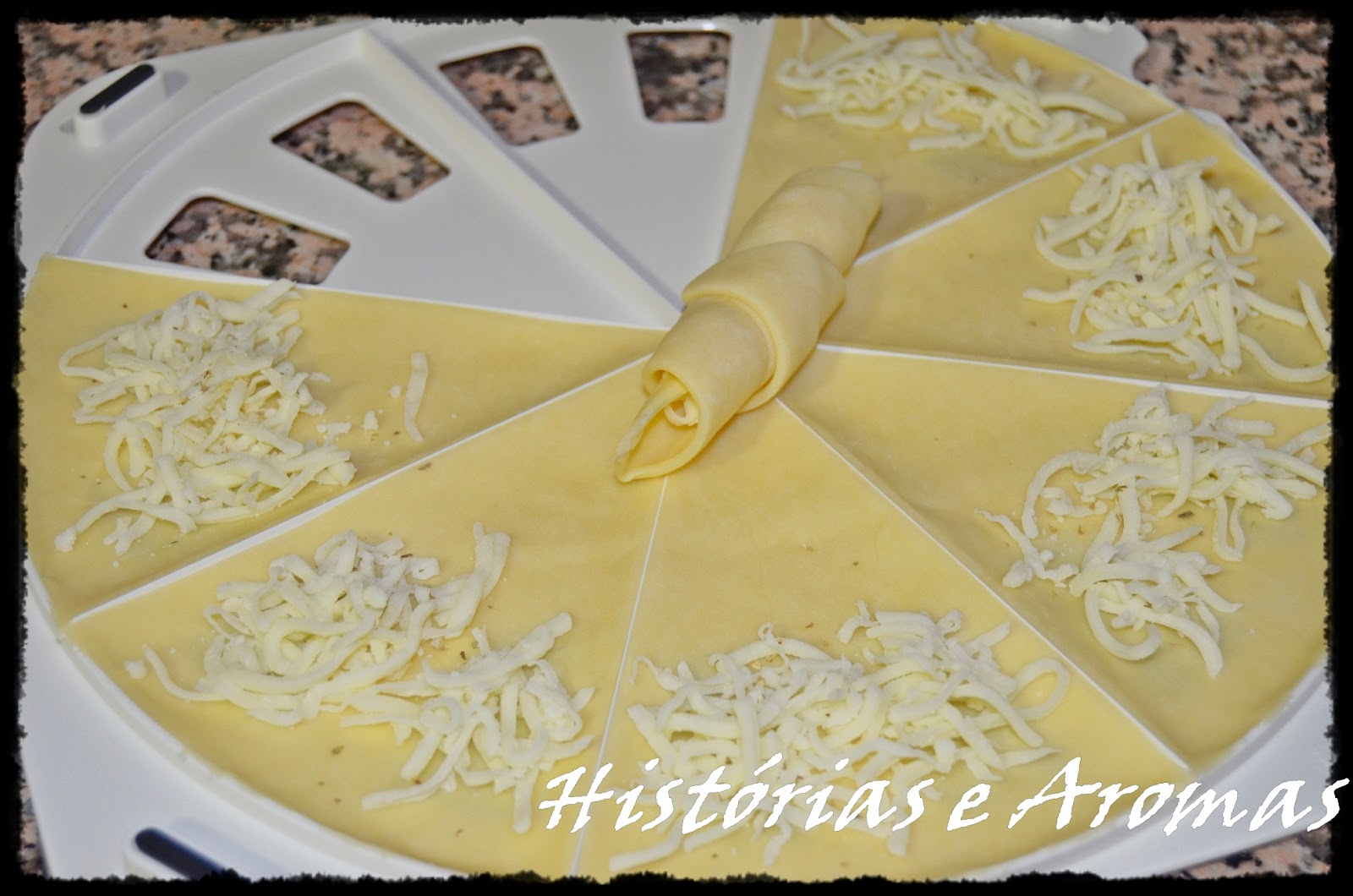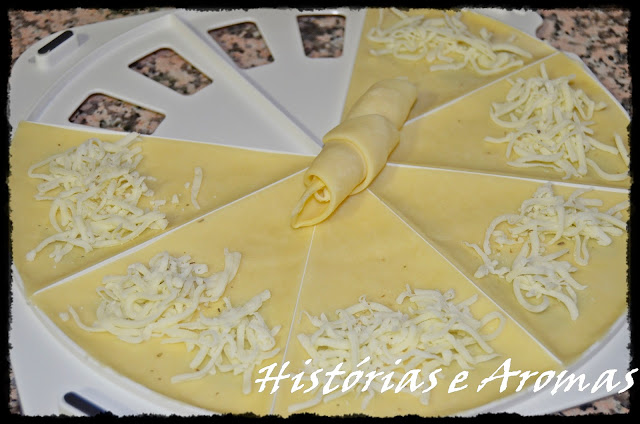 • Começar a rechear cada fatia de massa ( neste caso, com queijo mozzarella ralado e orégãos ), de forma a que o recheio fique dentro das saliencias abertas que o croissant party tem ( podemos observar isso na imagem a cima por baixo de cada fatia de massa).